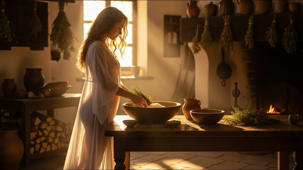 隠された中世のキッチンで、乙女が静かにパンを焼く姿を描いたAI映像。幻想的な世界の中で、日常の優雅さを感じてください。